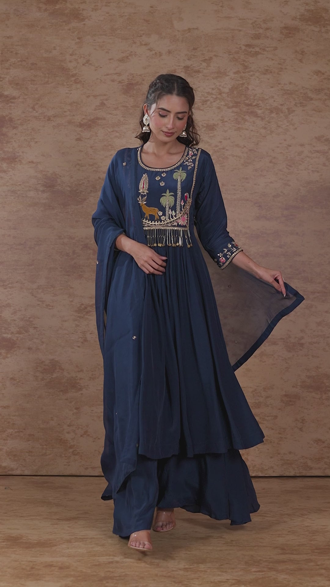 Deep Blue Embroidered Premium Silk Palazzo Set