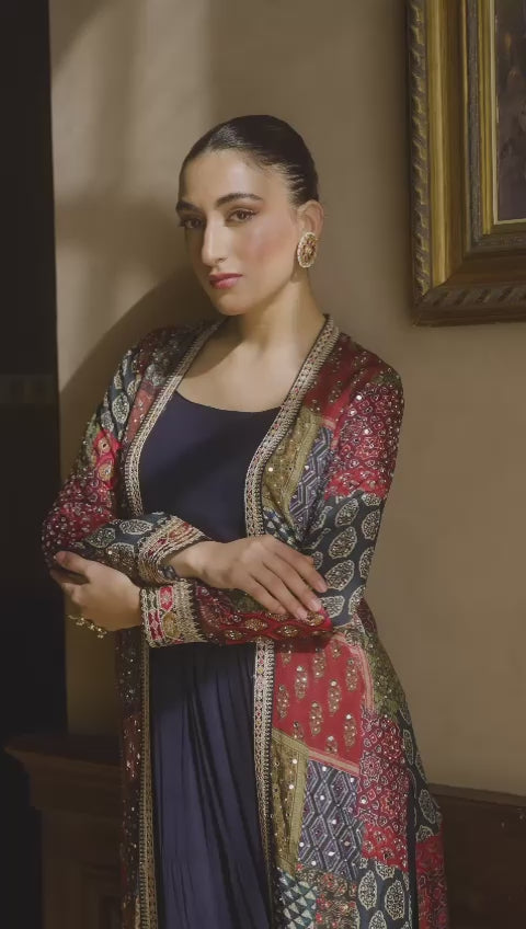 Expertly handcrafted with traditional mirror and aari taari embroidery, the Deep Blue Traditional Printed Jacket Gown adds a touch of elegance to any semi-formal outfit. Made with premium georgette silk, it comes with a matching dress and a waistbelt. Elevate your style with this sophisticated piece.