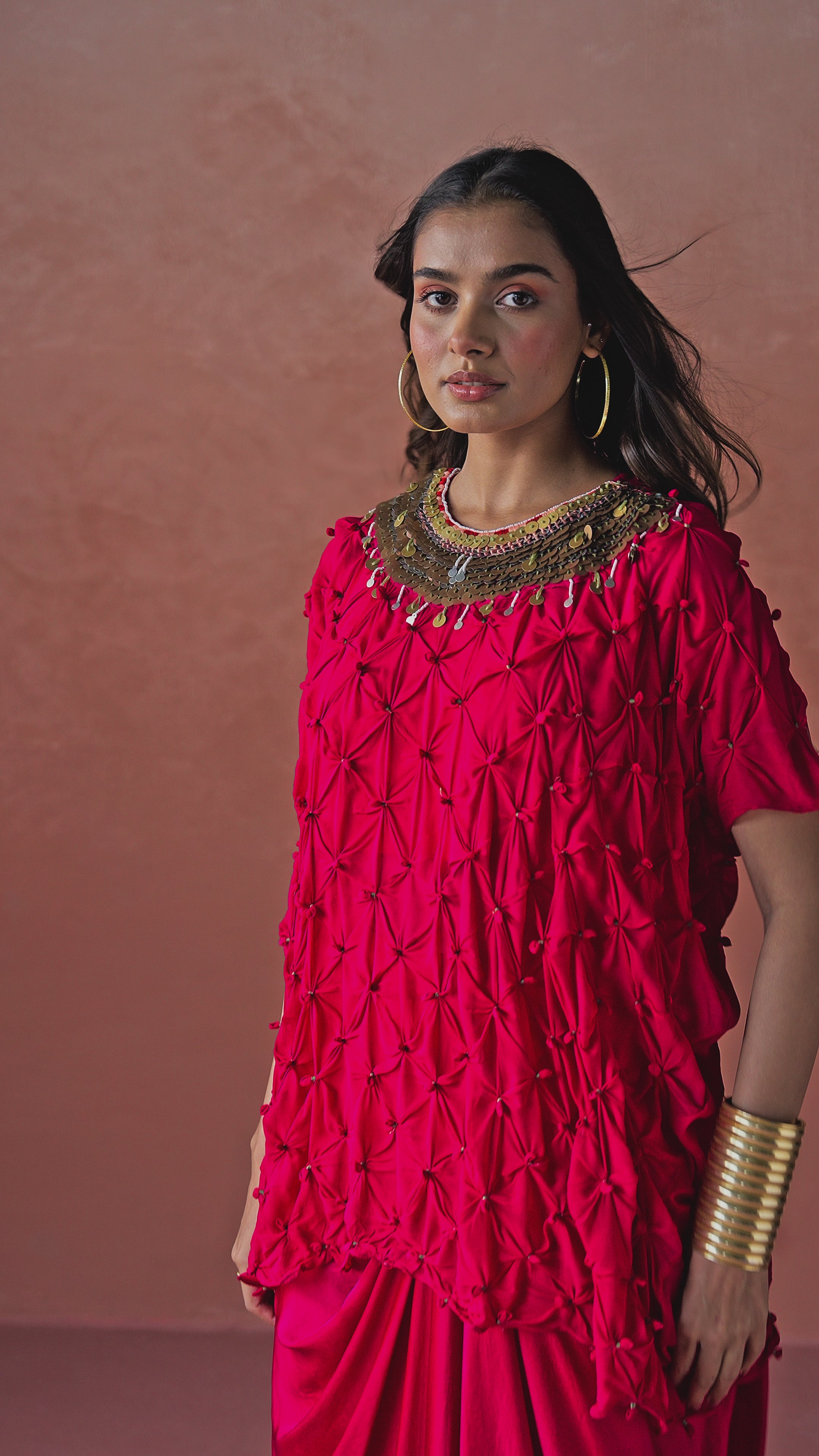 This stunning outfit is crafted in rich georgette fabric in a vibrant Deep Fuchsia Pink shade. The top features intricate sequin and bead work around the neckline, adding a touch of elegance and glamour. The textured, pleated detailing throughout the top enhances its modern appeal. Paired with coordinated satin draped skirt, the look is both elegant and contemporary — perfect for festive occasions or statement evening wear.