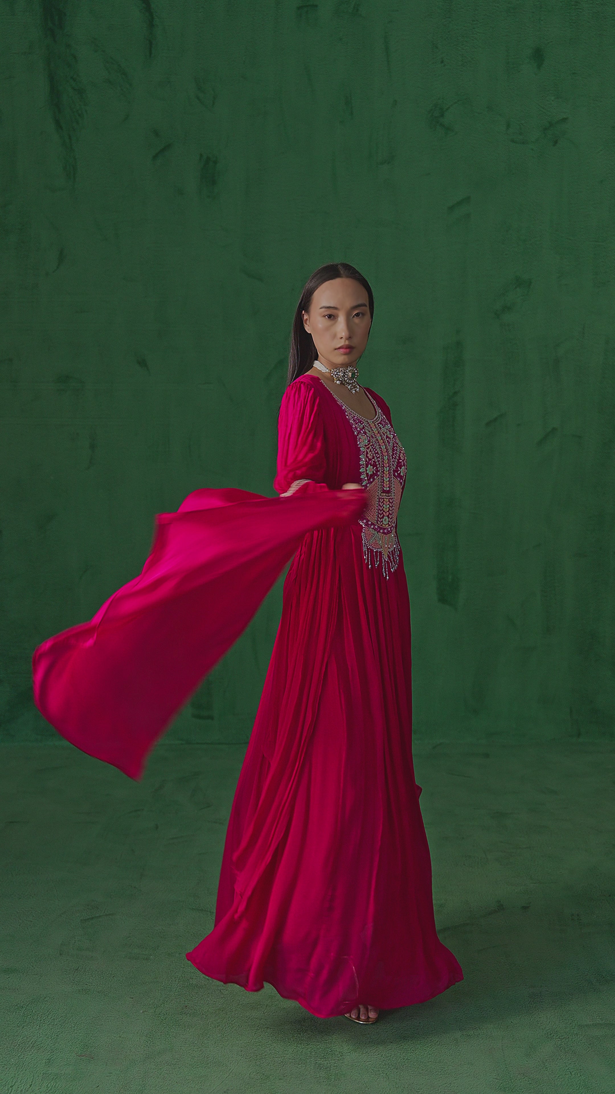 Deep Pink Embellished Chinon Silk Pleated Gown