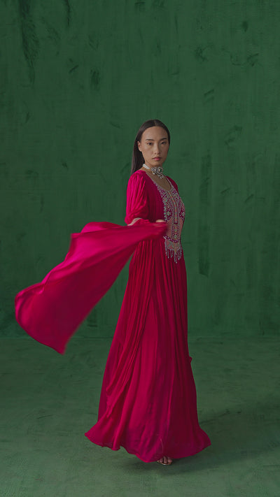 Deep Pink Embellished Padded and Pleated Gown with Can-can and Flair Sleeves