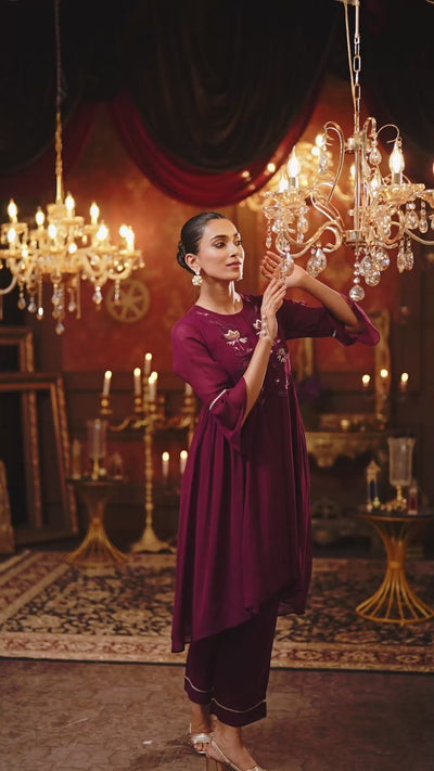 A graceful two-piece set in sheer Georgette Silk, featuring a flowy, asymmetrical flair kurta with delicate bell sleeves and a mandarin collar. The sophisticated floral hand-embroidery on the yoke is paired with a matching pant for a complete, elegant look.