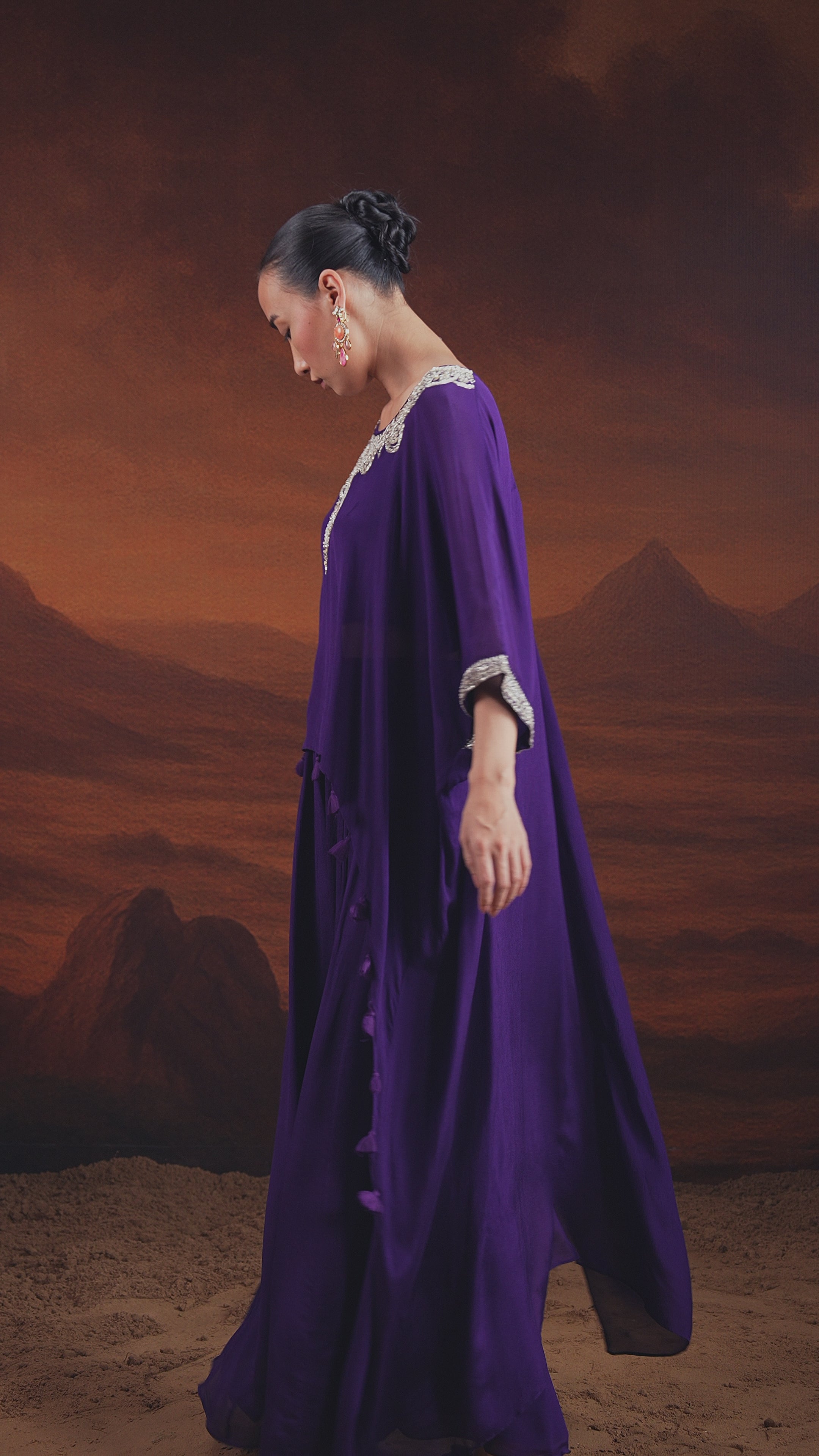 Deep Purple Embellished Chinon Silk Kaftan Set