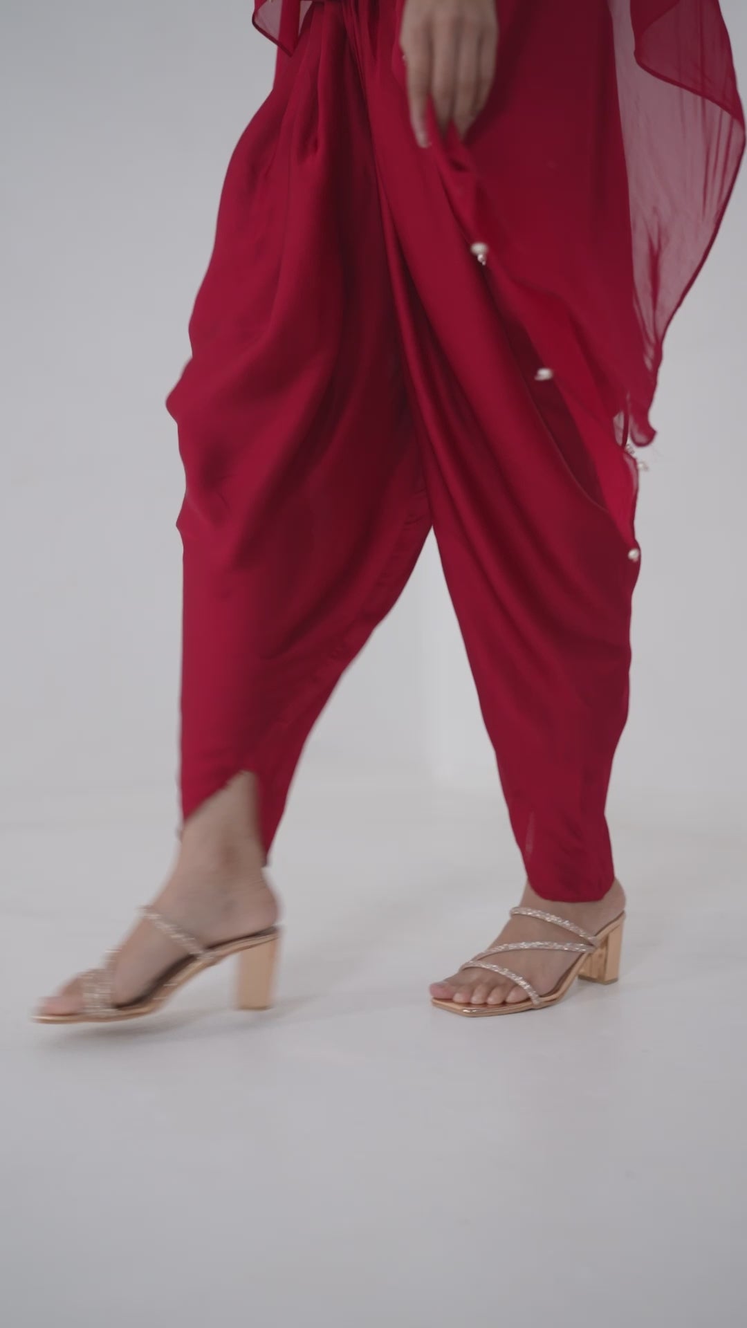 The Deep Red Embroidered Organza Silk Kaftan Set features a kaftan-style top with flare sleeves, detailed with bead, zari, and gota handwork. It is paired with matching satin silk jasmine dhoti pants, making it perfect for semi-formal wear.