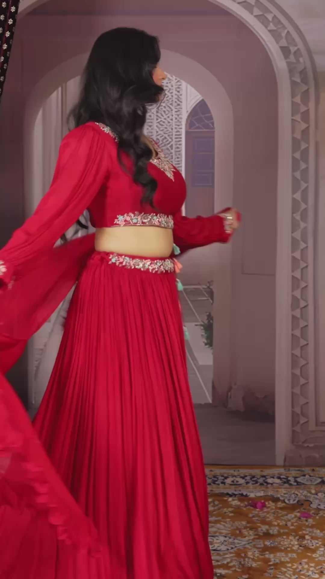 Introducing our Royal Red Embellished Chinon Silk Skirt Set, featuring stunning sequin, bead, cut dana, zari, stone and aari tari handwork on the crop top. This exquisite set is beautifully paired with a matching skirt and an elegant dupatta. Perfect for special occasions, it combines modern glamour with traditional artistry.