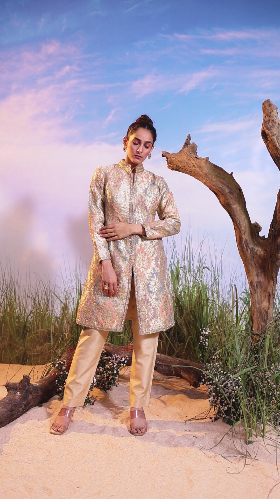 This elegant two-piece ensemble is designed for refined festive or formal occasions. It features a knee-length Jacket-Style Kurta with a mandarin collar and a front slit, showcasing a dense, multi-color brocade design. The kurta is paired with sleek, straight-fit Pants, creating a sophisticated Indo-Western silhouette.