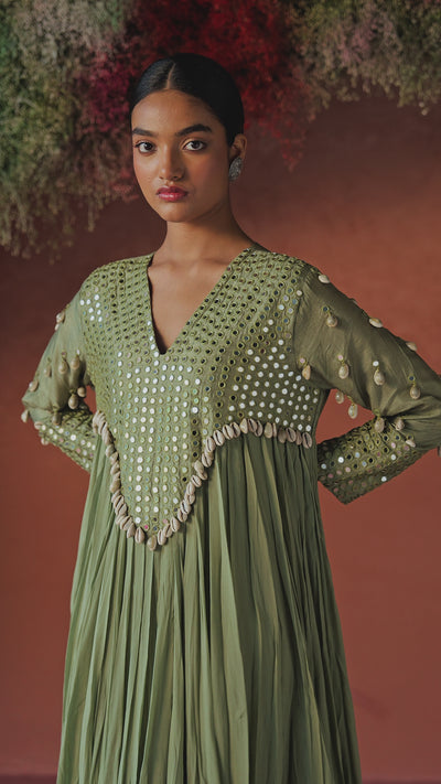 A flowy georgette gown in a soft sage green, adorned with intricate mirror work and delicately hand-embroidered seashells. The relaxed silhouette blends artisanal charm with modern elegance, making it perfect for festive.