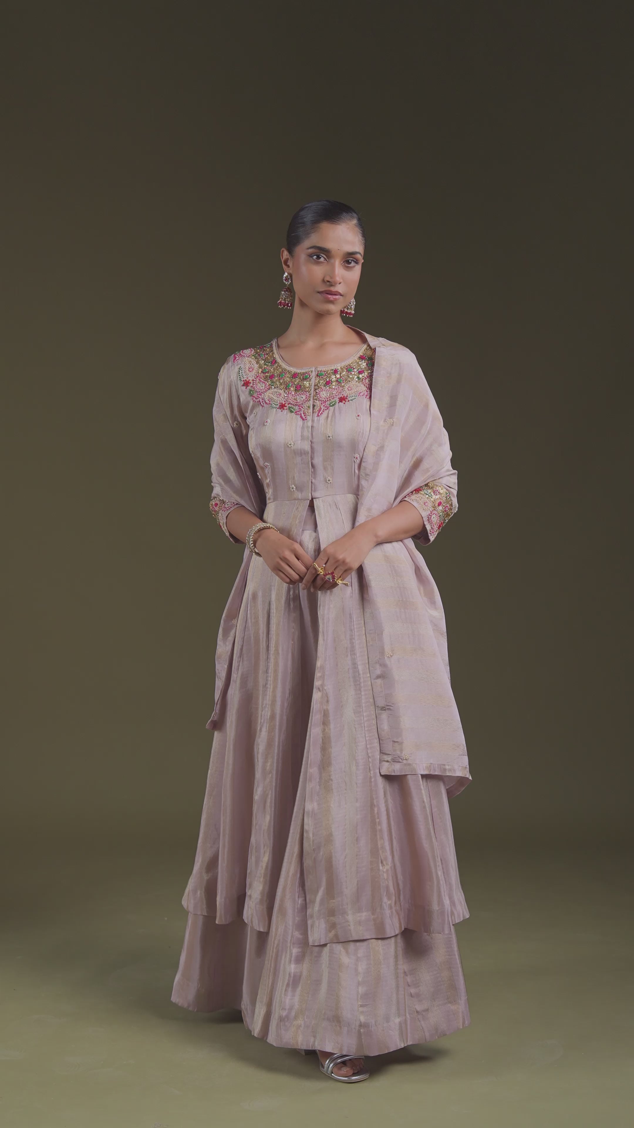 This graceful ensemble features a shimmer tissue silk kurta, skirt, and dupatta in a delicate dusty mauve hue. It is intricately embellished with zari, sequins, beadwork, cut dana, and golden thread work, creating a rich and festive look. The neckline and cuffs are enhanced with colorful embroidery threads and stonework, adding vibrant detail to the soft base. Perfect for weddings and special occasions, it beautifully blends traditional charm with modern elegance.