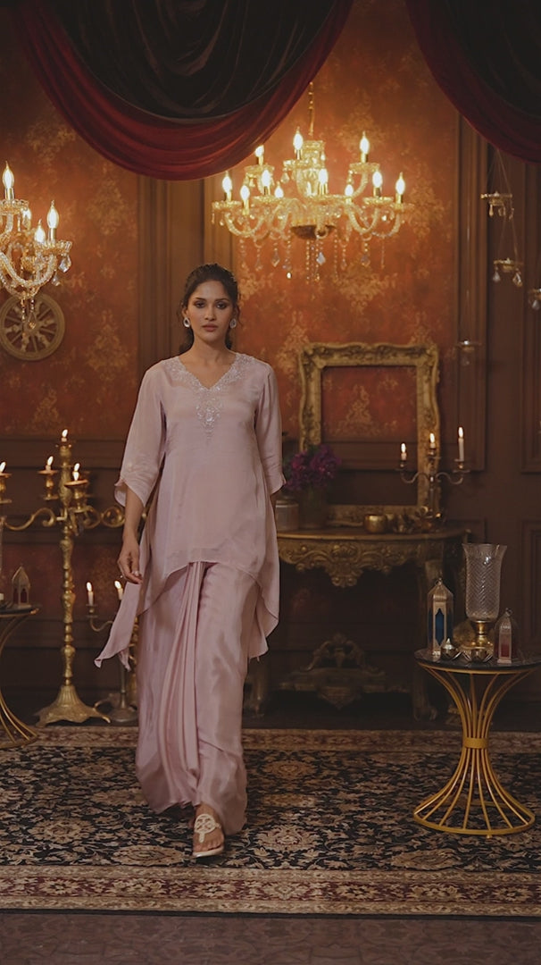 Exude understated glamour in this exquisite two-piece set, crafted from flowy Chinon Silk. It features a modern asymmetric kurta with elegant hand-work on the neckline, perfectly paired with a fashion-forward, draped skirt.