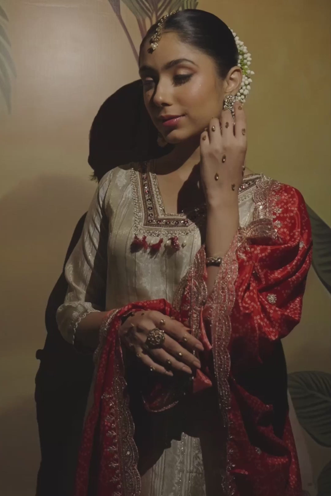 Celebrate the festive season in timeless elegance with this Traditional Ivory Palazzo Set, meticulously crafted from premium silk. The kurta is richly embellished with intricate handwork featuring Cut Dana, Zari, Sequins, Beads, Aari Tari, and Pearls reflecting fine craftsmanship and heritage design