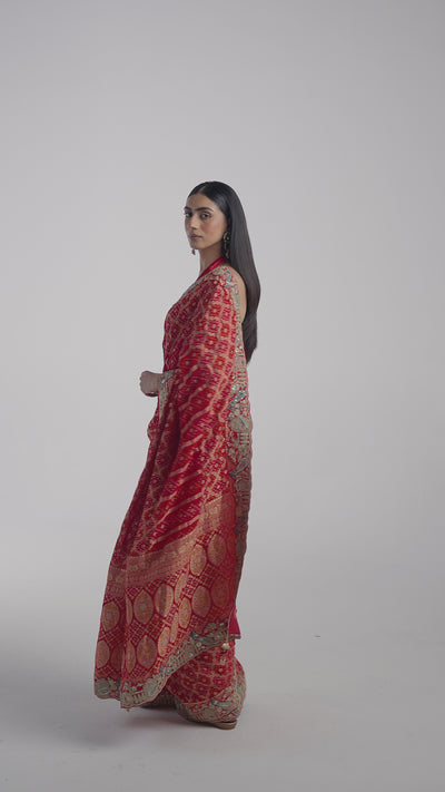 Step into radiant elegance with this Bright Red Banarasi Silk Saree, a masterpiece of Bandhani artistry beautifully adorned with opulent golden handwork. The ensemble perfectly blends traditional print with contemporary detailing, promising to leave a lasting impression.