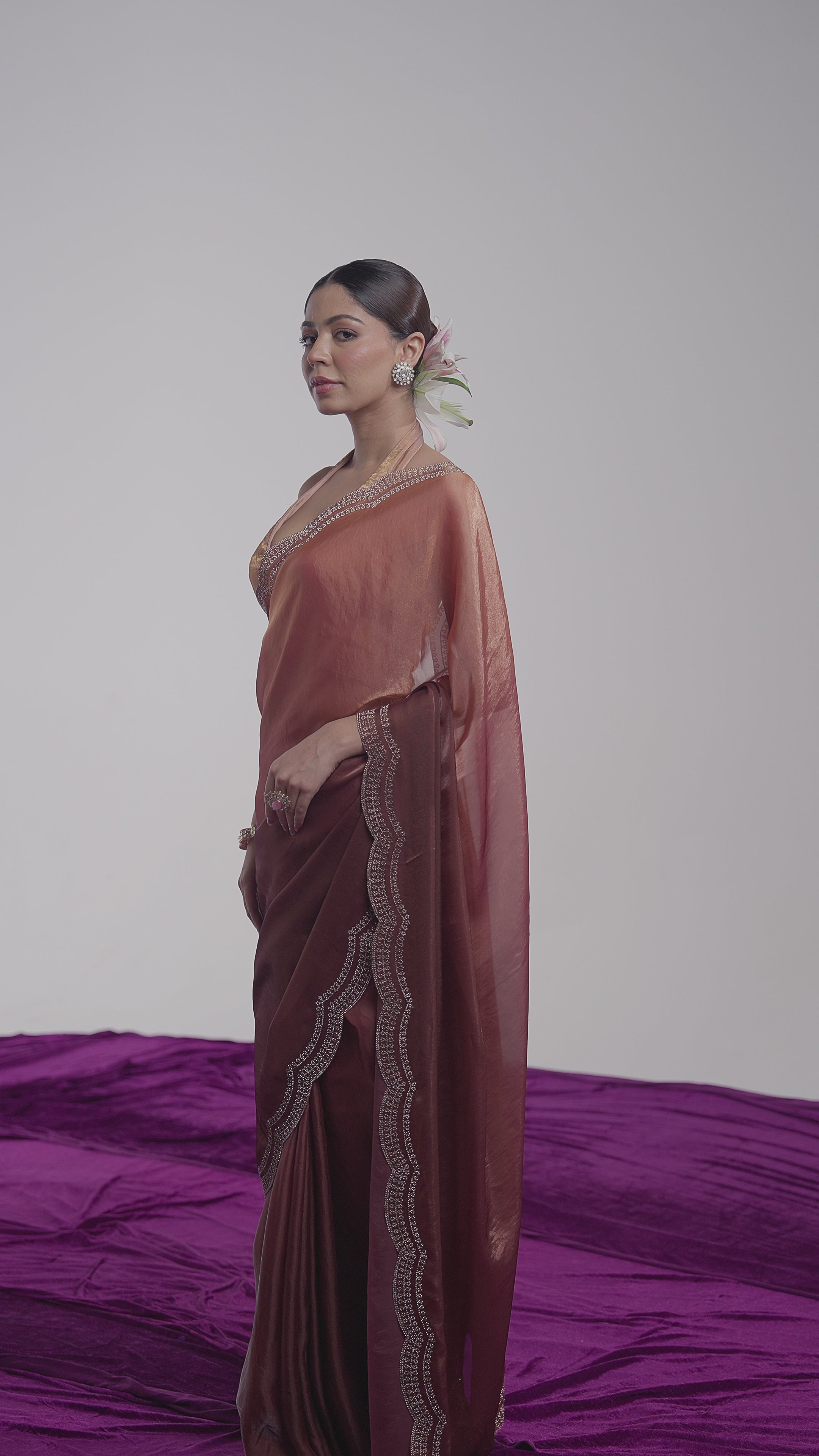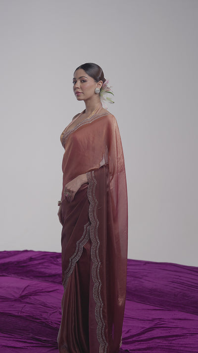 Exude dramatic elegance in this stunning Copper to Rust Ombré Saree, a radiant blend of luminous shimmer and fluid grace. The captivating color transition and exquisitely embellished border make this an unforgettable piece for any grand occasion.