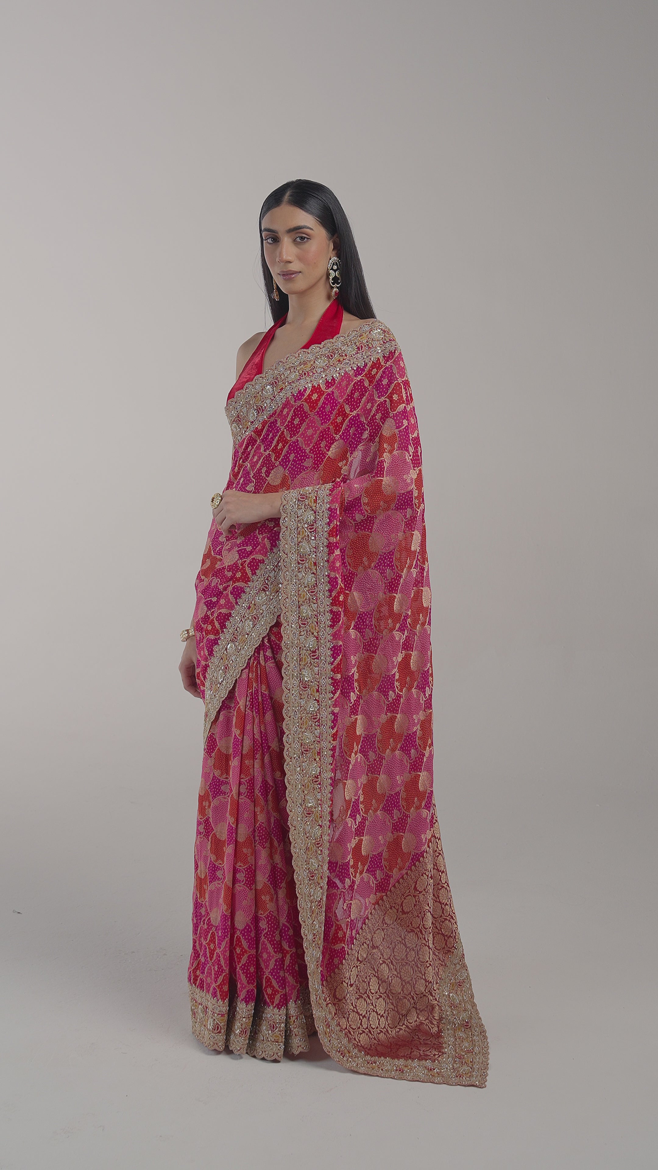 Step into timeless elegance with this dazzling Fuchsia and Red Silk Saree, a stunning blend of Bandhej artistry and opulent modern handwork. Adorned with a rich mix of golden sequins, beads, and cut dana, this saree is the perfect choice for weddings, festivals, and grand celebrations.