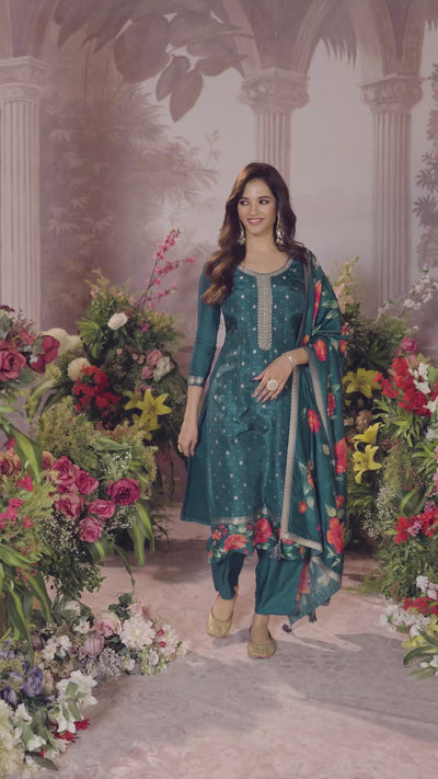 Deep Teal Embellished Brocade Silk Pant Set
