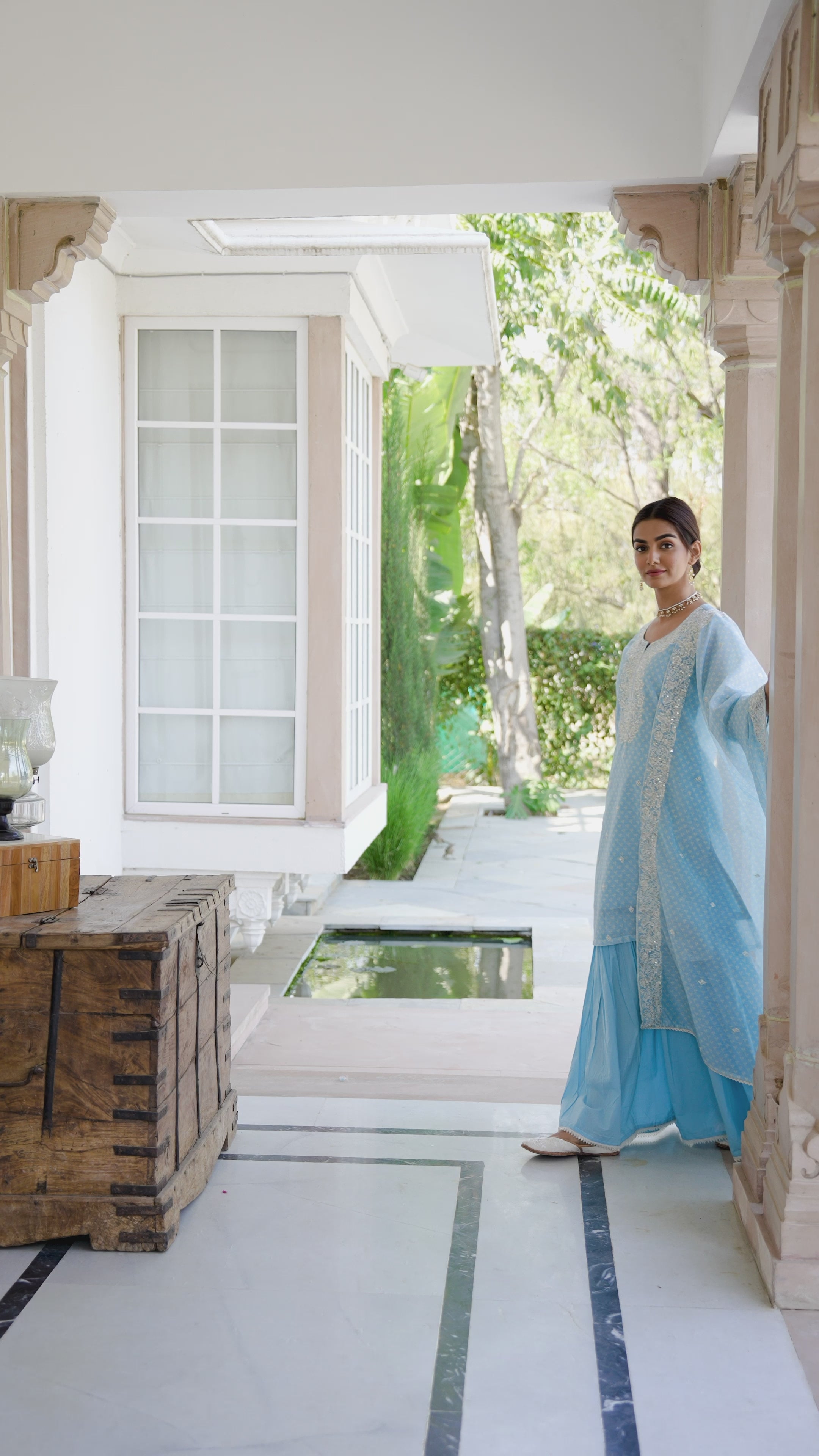 Sky Blue Printed embroidery neckline kurta. Paired with cotton sharara and digital printed embroidered dupatta.