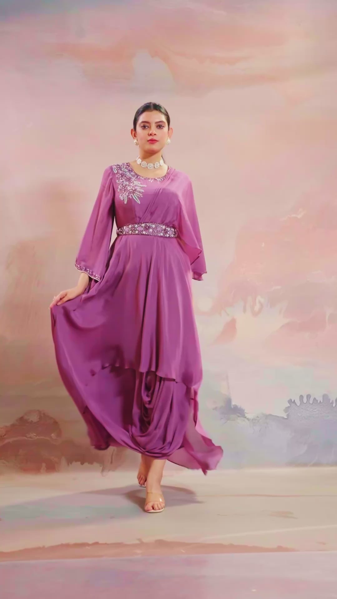 Resonates your look with style and refinement with our Magenta Embellished Chinon Silk Cowl Gown. The meticulously hand-worked of sequins, cutdana and beads work on the gown showcase exquisite craftsmanship. This ensemble radiates effortless grace. Perfect for year-round festivities.
