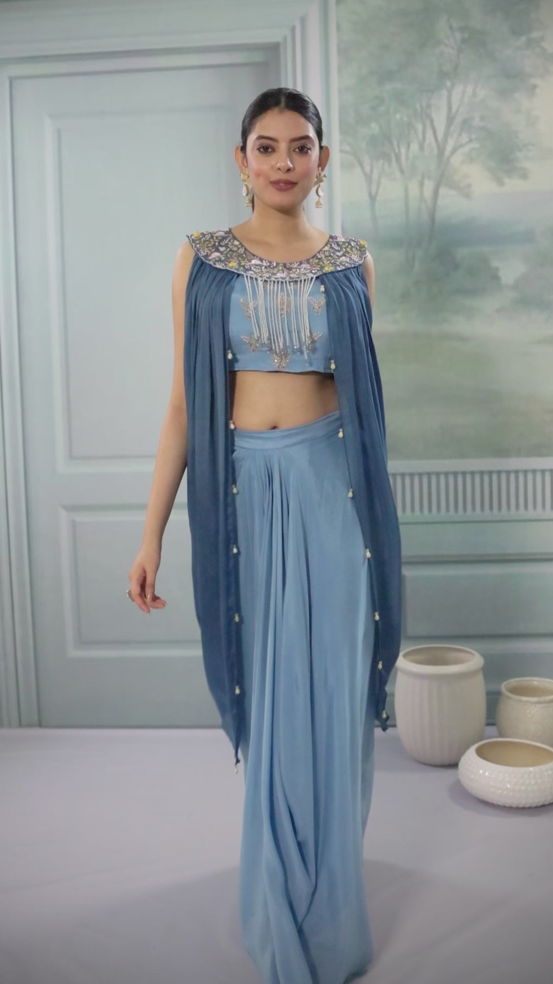 Resonates your look with style and refinement with our Blue Embellished Chinon Silk Skirt Set. The meticulously hand-worked of sequins, beads and zari work on the cape style crop top showcase exquisite craftsmanship. Complemented by matching premium silk draped skirt. This ensemble radiates effortless grace. Perfect for year-round festivities.