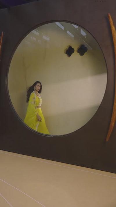 A vibrant Marigold Georgette Silk Lehenga Set featuring a voluminous skirt with can-can and a dramatic flowing cape. The padded crop top, cape borders, and belt are richly embellished with dazzling sequin, pearl, and golden thread work.