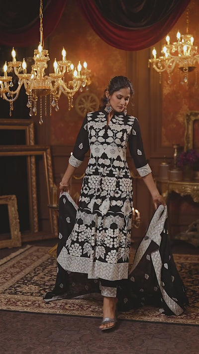 This striking three-piece set, crafted from flowing Georgette Silk, is the epitome of monochrome elegance. It features a beautifully flared, frock-style kurta adorned with detailed contrast embroidery, a matching pant with a patterned hem, and a coordinating dupatta.