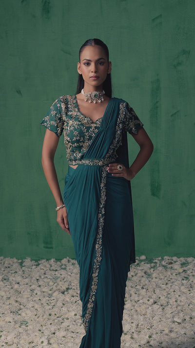 Emerald Teal Embellished Lycra Silk Draped Saree