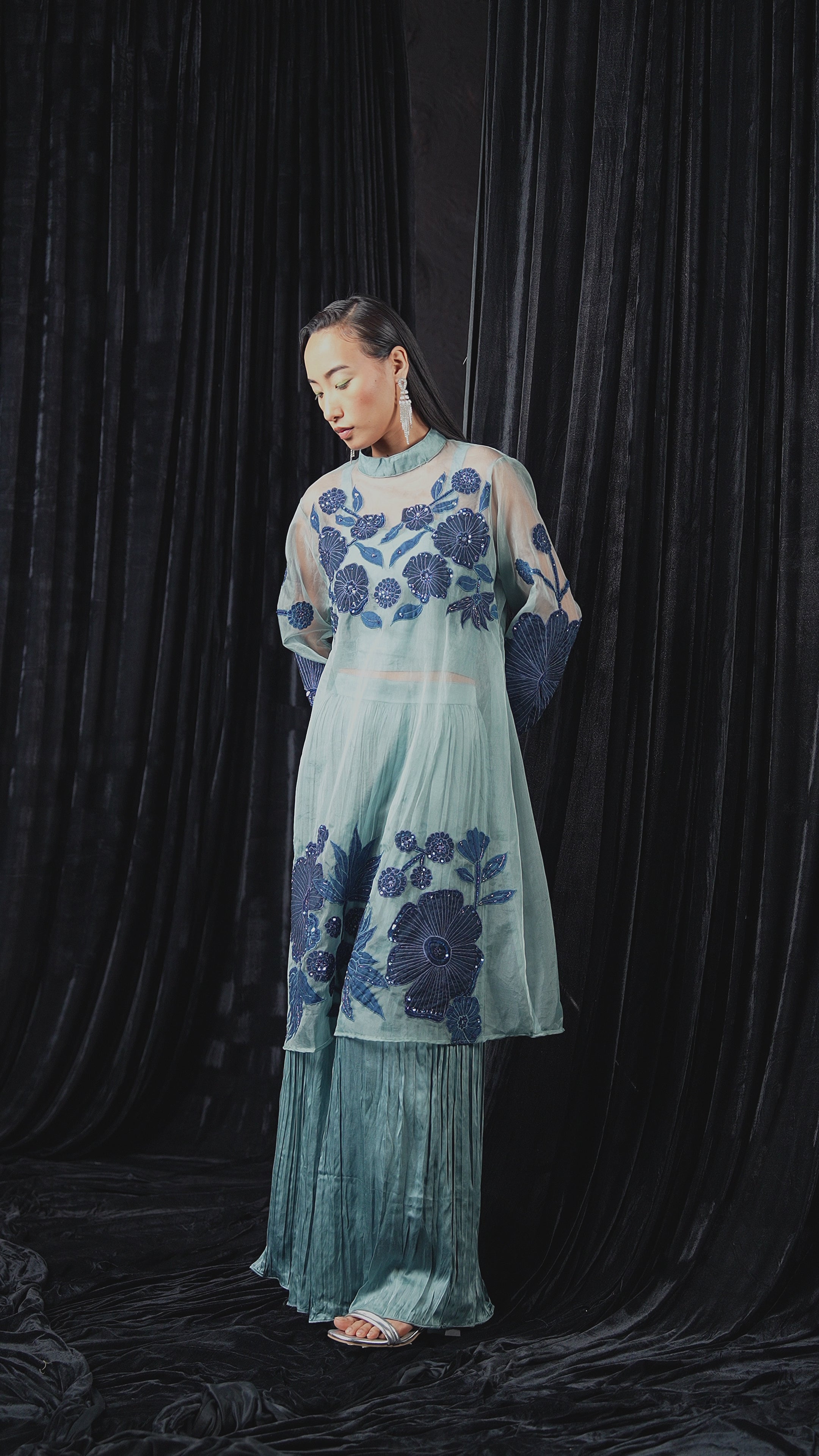 Embrace modern sophistication in this stunning Dusty Teal Crepe Silk and Organza Silk ensemble. This three-piece set features an elegant pleated skirt, a cropped inner, and a semi-sheer Organza Silk kurta with intricate, dark blue floral hand-embroidery.