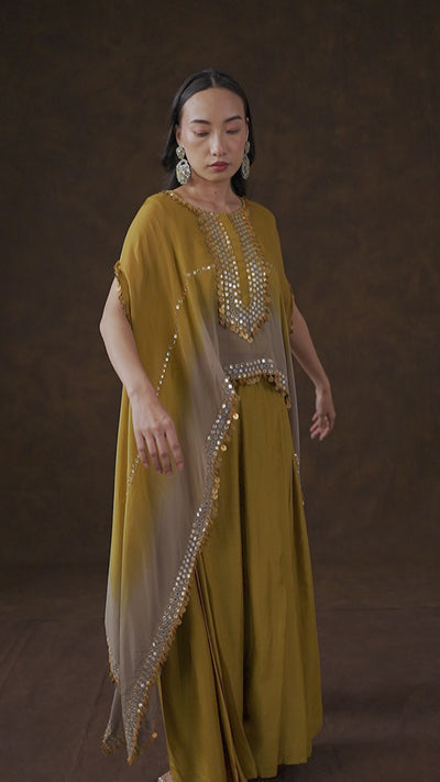 Make a truly unforgettable entrance in this glamorous Mustard Ombré Palazzo Set. This three-piece ensemble features a flowing raw silk inner and pleated palazzo pants. The statement piece is the organza silk cape, which showcases a dramatic ombré effect and is richly detailed with intricate mirror work, decorative coins, and shimmering gota along the neckline and hem.