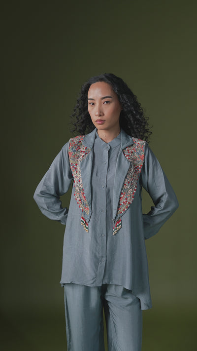 Embrace a look of modern sophistication in this chic Slate Blue Co-Ord Set. This two-piece ensemble is crafted from raw silk, featuring a contemporary, asymmetrical shirt with a collar beautifully adorned with intricate multi-colored bead, thread, sequin, and zari handwork. The look is completed with a pair of perfectly matched wide-legged pants.