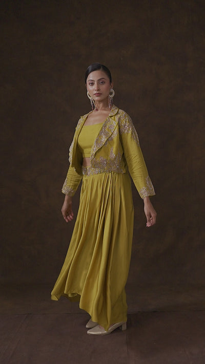 Make a luxurious and contemporary statement in this vibrant Mustard Green Skirt Set. This three-piece ensemble features a flowing satin silk skirt with a dramatic high-low hem, paired with a coordinating crop top. The standout piece is the cropped raw silk jacket, which is completely covered in intricate handwork including zardozi, zari, sequins, and beads, elevating the entire outfit.