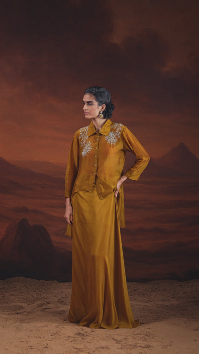 Make a sophisticated statement in this elegant Bronze Gold Skirt and Kurta Set. Crafted from lustrous satin silk, the kurta features an asymmetrical hem and a collar beautifully adorned with intricate sequin, bead, and cut dana handwork. It's perfectly complemented by a flowing matching skirt for an effortlessly graceful look.