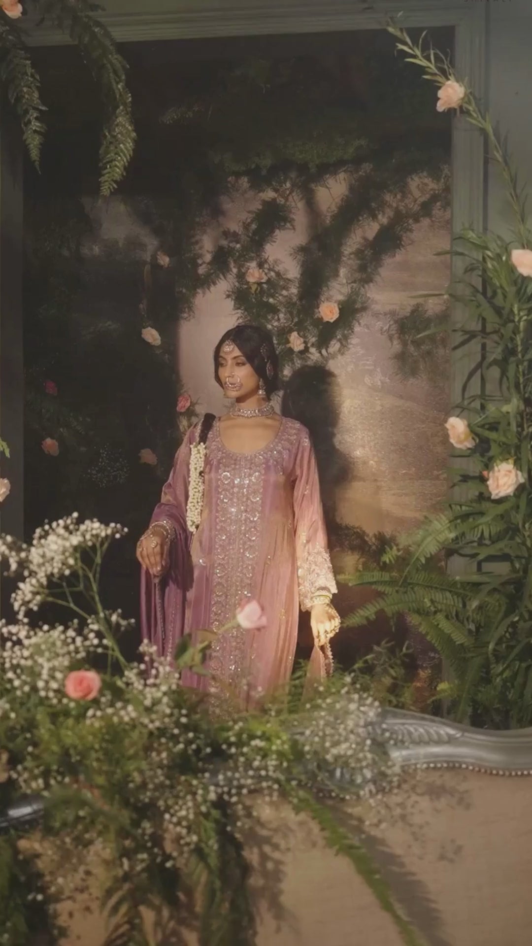 Fabric: The kurta and dupatta are meticulously crafted from Premium Shimmer Tissue Silk for an iridescent, metallic finish, while the palazzo is made from structured Uppada Silk for a refined drape.