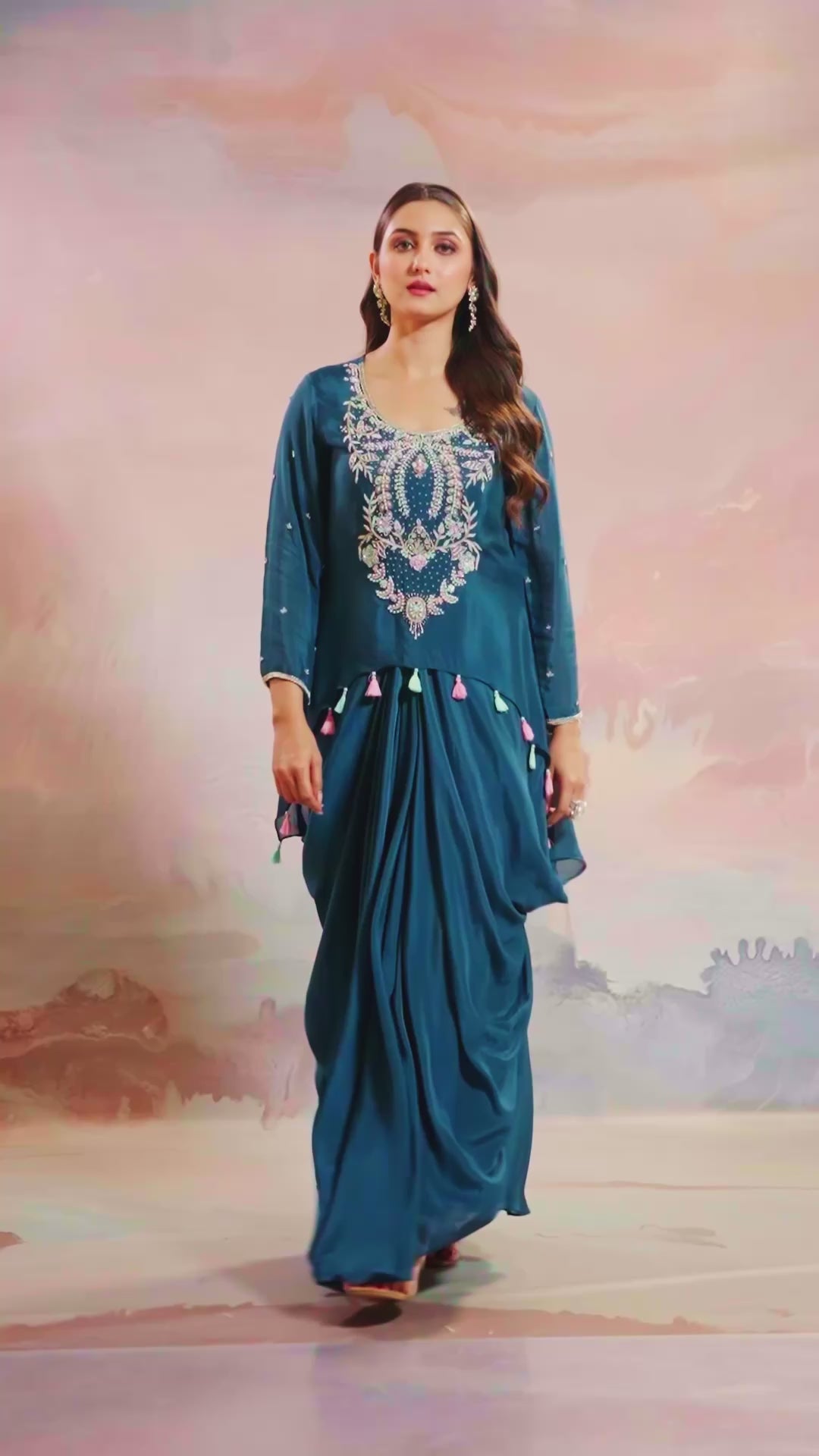 This Blue Embroidered Chinon Silk Skirt Set radiates the epitome of timeless sophistication. The meticulously hand-worked of sequins, beads and zari work on the asymmetrical tunic showcase exquisite craftsmanship. Complemented by matching premium silk draped skirt. This ensemble radiates effortless grace. Perfect for year-round festivities.