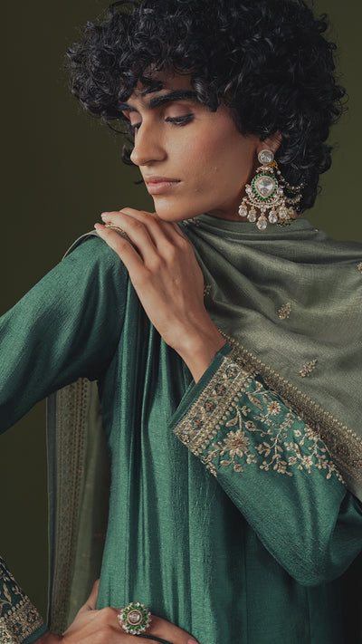Emerald Green Embellished Raw Silk Anarkali Set