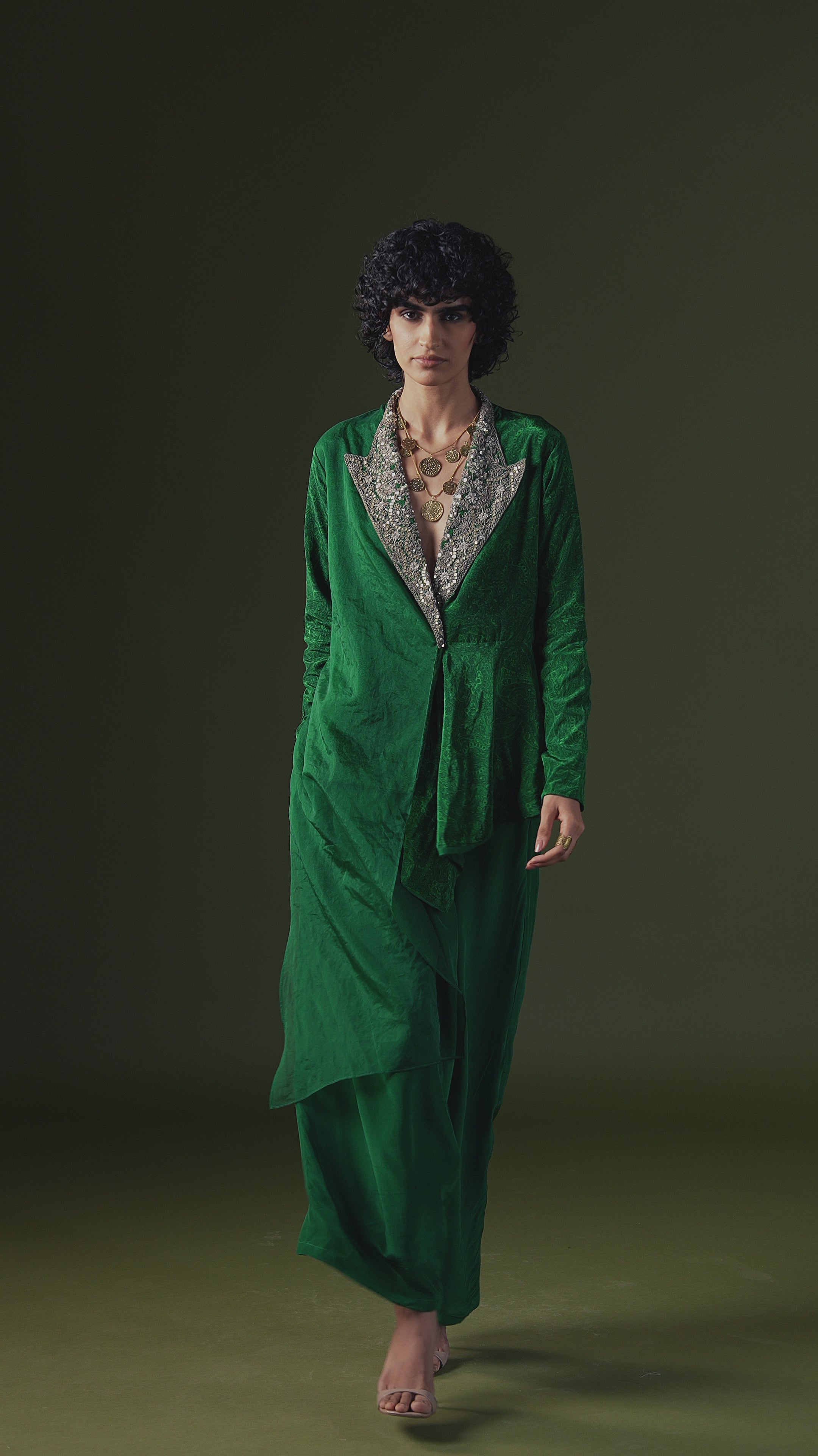 Make a luxurious statement in this magnificent Emerald Green Co-Ord Set. This two-piece ensemble, crafted from lustrous satin silk, features a sophisticated long shirt with a dramatic lapel and a side fall. The lapel is beautifully embellished with intricate zardozi, zari, and sequin handwork, creating a stunning focal point. The look is completed with a pair of flowing, wide-leg pants.