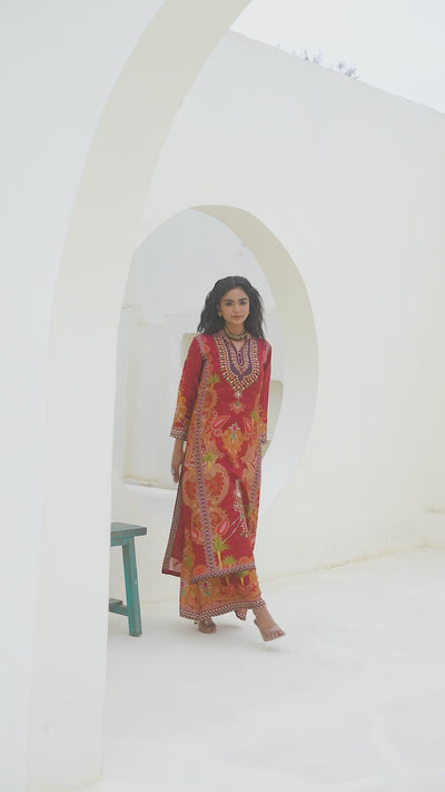 Breeze through summer in our red ethnic printed dola silk kurta palazzo set that reflects grace in every stitch. This ensemble features an ethnic printed dola silk straight kurta. Paired with matching malai cotton palazzo pants. Perfect for semi-formal occasions. Elevate your ethnic style in our everyday life with comfort and elegance.