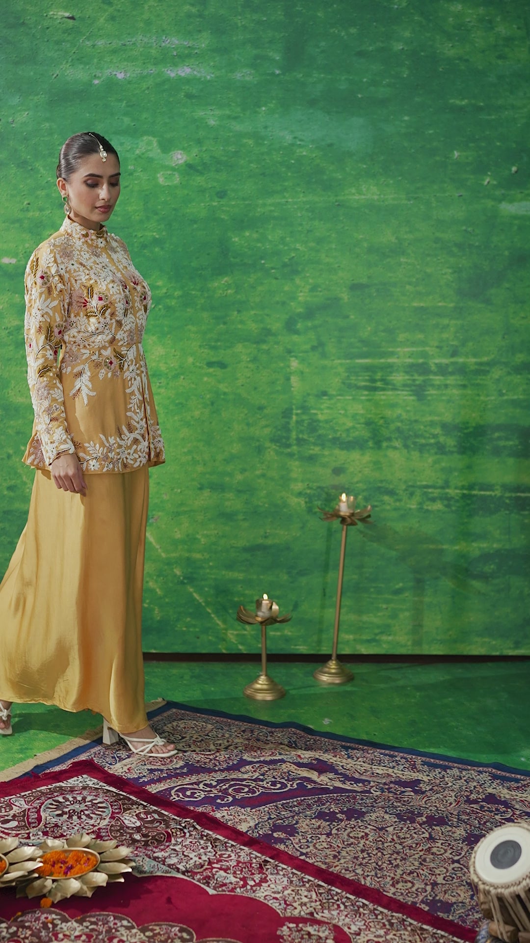 Introducing our Festive Yellow Embroidered Raw Silk Skirt Set. This stunning ensemble features a beautifully padded peplum adorned with intricate handwork, including sequins, zari, and beads. The set is paired with a matching solid satin silk draped skirt, making it perfect for semi-formal occasions.