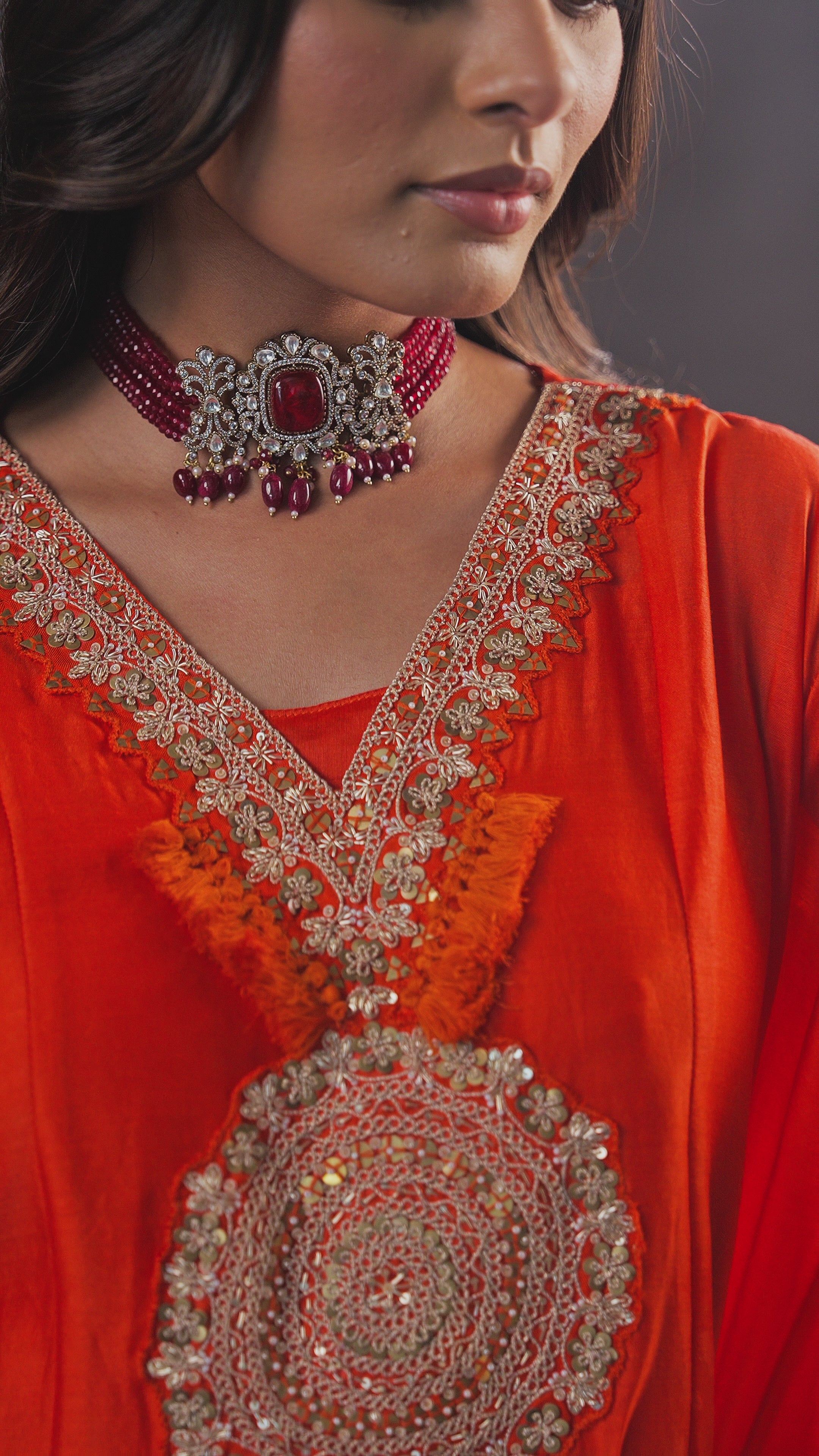 Flame Orange Embellished Organza Tissue Silk Kaftan Set