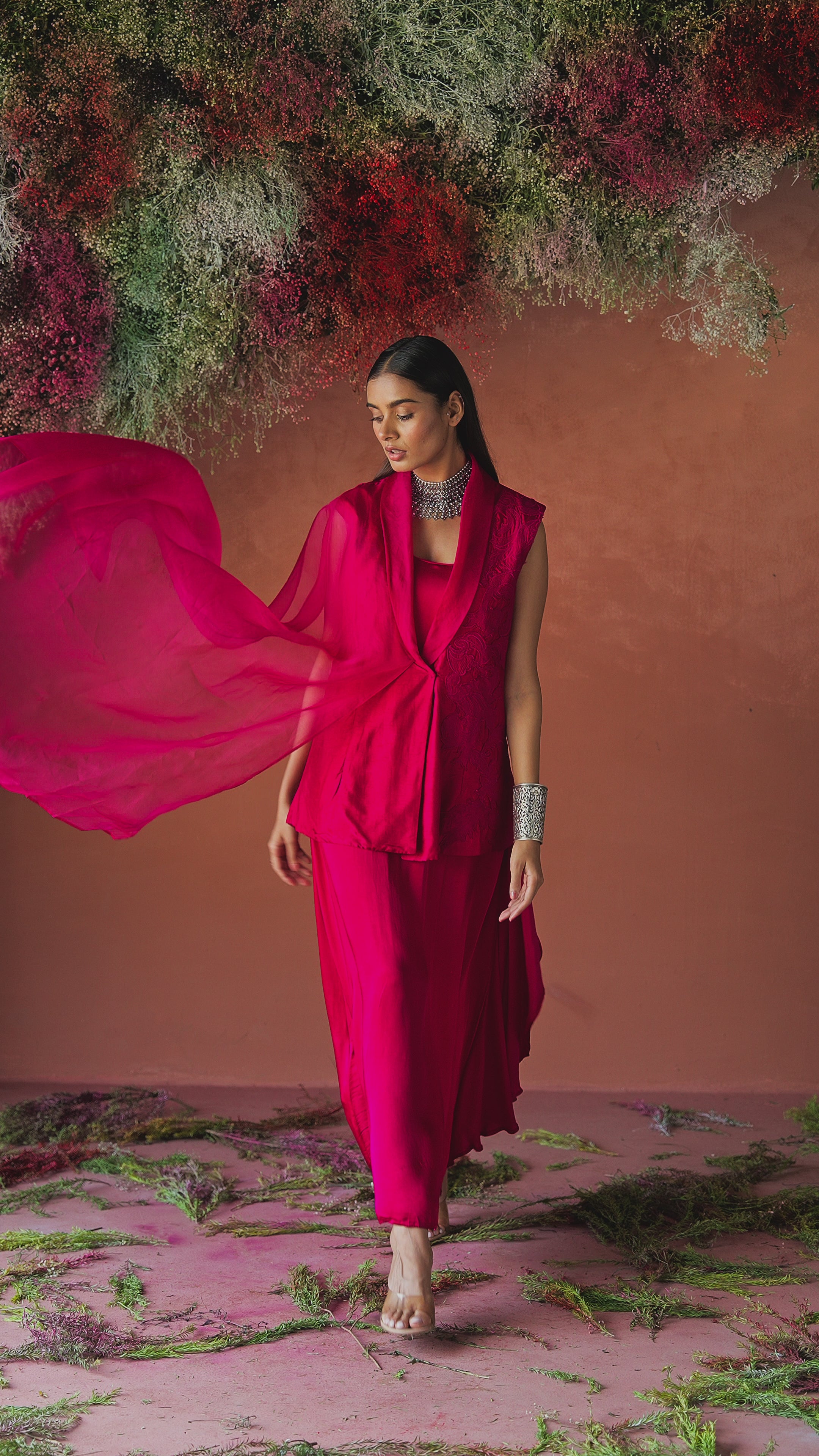 This elegant ensemble features a jacket-style dress crafted from raw silk in a striking fuchsia pink shade. The sleeveless jacket is adorned with subtle patchwork embroidery, adding texture and artisanal charm. Beneath it lies a solid-colored, flowy inner dress that brings a clean, contemporary contrast. The look is elevated with a decorative organza drape that cascades softly from the shoulder, lending fluidity and grace to the outfit.
