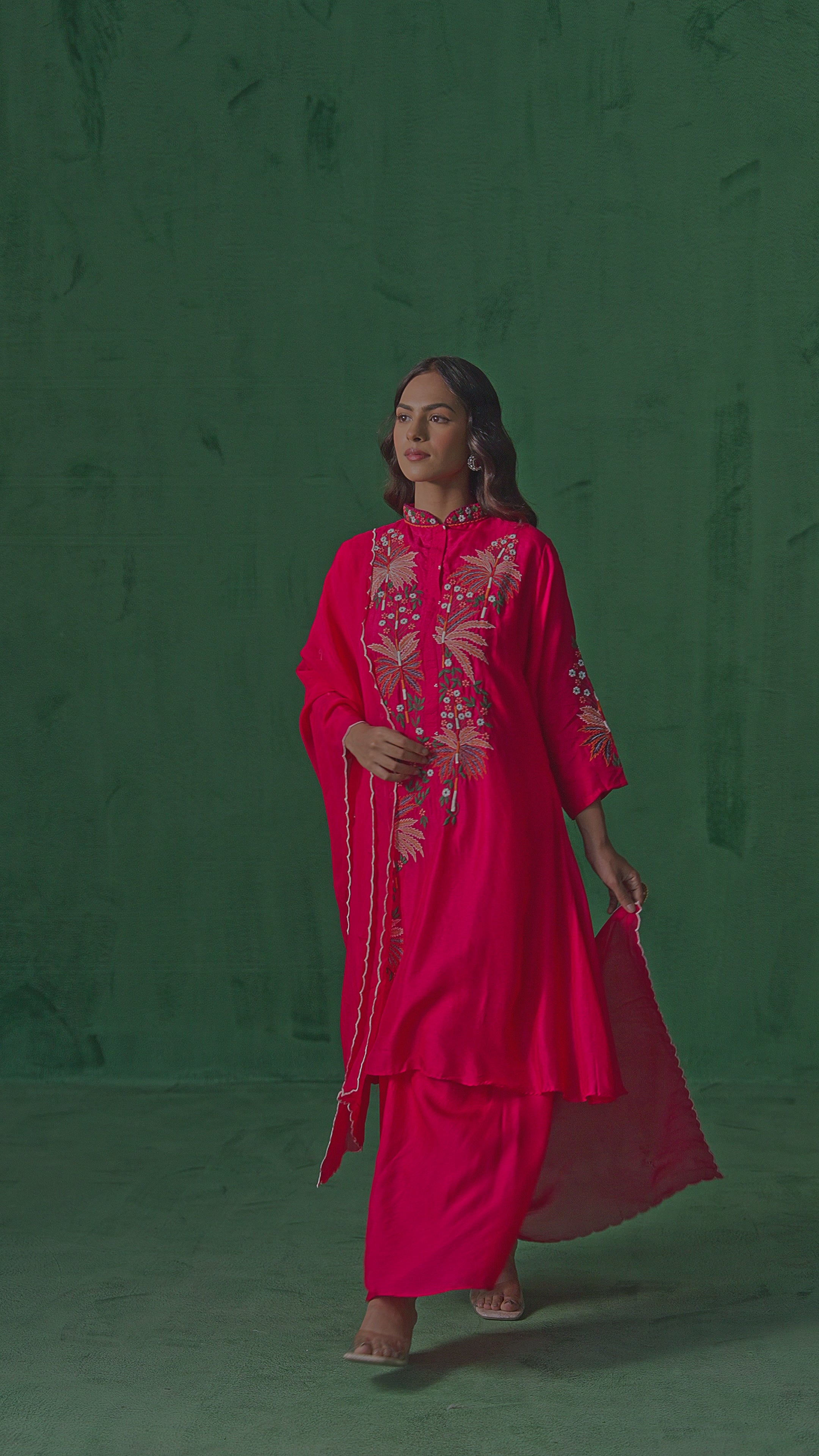 This elegant ensemble features a vibrant kurta and palazzo set crafted from luxurious raw silk fabric, offering a rich texture and graceful drape. The kurta is adorned with intricate embroidery work, showcasing delicate floral motifs for a sophisticated look. It is paired with an airy organza dupatta highlighted with a scalloped border, adding a touch of femininity and charm. Perfect for festive occasions or formal gatherings.