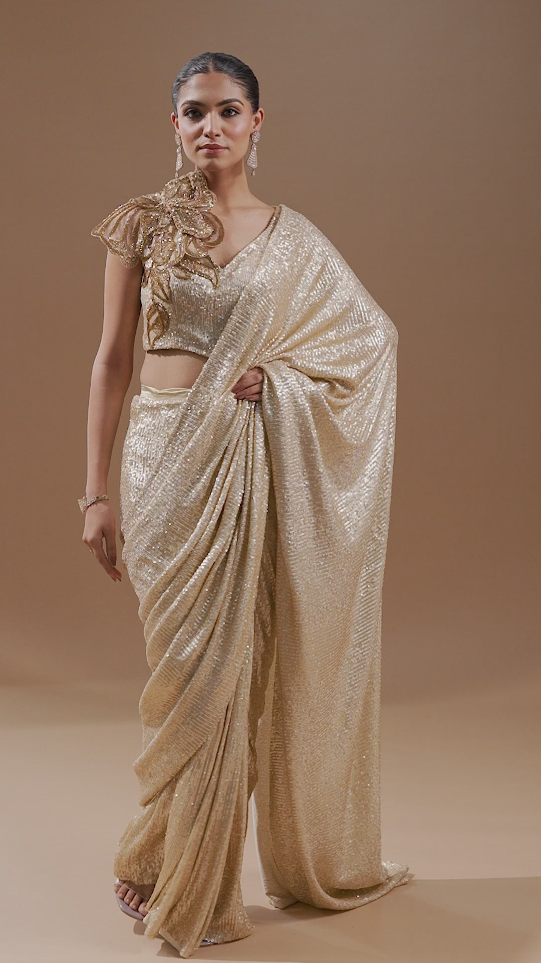 This exquisite gold saree, crafted from soft net fabric, features delicate shimmering sequins that dance with every step, catching the light with a magical glow. The saree is gracefully framed with a flower motif at the blouse, adding a touch of feminine charm. Ideal for upscale weddings, evening receptions, or cocktail parties, it effortlessly combines traditional sophistication with contemporary flair. The sheer fabric drapes beautifully, sculpting a flattering silhouette that accentuates your natural beauty and grace.