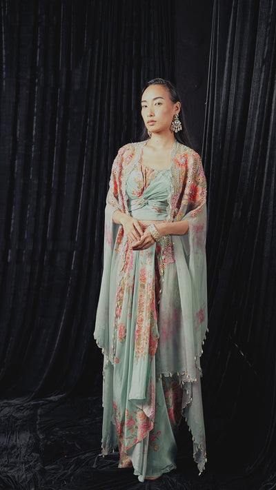 This elegant three-piece ensemble features a stunning blend of textures and styles. The set includes a crepe silk crop top with a coordinating draped skirt, both adorned with a vibrant floral print. Completing the look is an organza silk cape, which is beautifully embellished with intricate bead, mirror, and sequin work, adding a touch of sparkle and sophistication. The flowing silhouette and delicate craftsmanship make this outfit perfect for a special occasion.