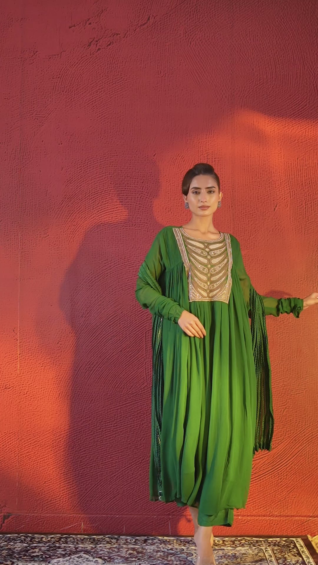 The Dark Green embellished premium georgette long kurta set. Kurta features handcrafted sequin, Zari, bead and Aari work. It comes with solid dark green silk dupatta and raw silk matching pants. The outfit also has Spanish silk green spaghetti top. This ensemble is great for semi-formal wear occasions, promises to highlight your outfit.