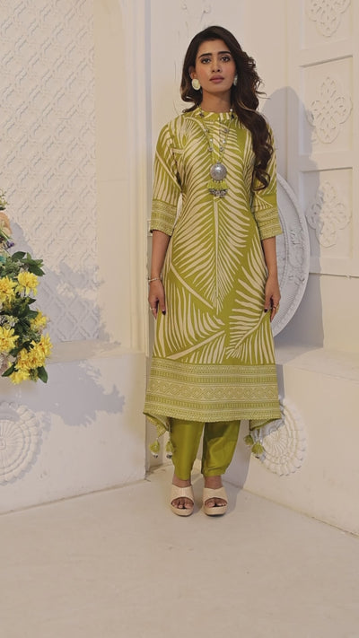 This is a chic Muslin Silk Kurta and Pant Set featuring a contemporary leaf print in a Lime Green and off-white palette. The luxurious fabric and bright color make it perfect for a stylish day event or festive gathering.
