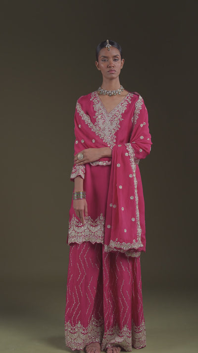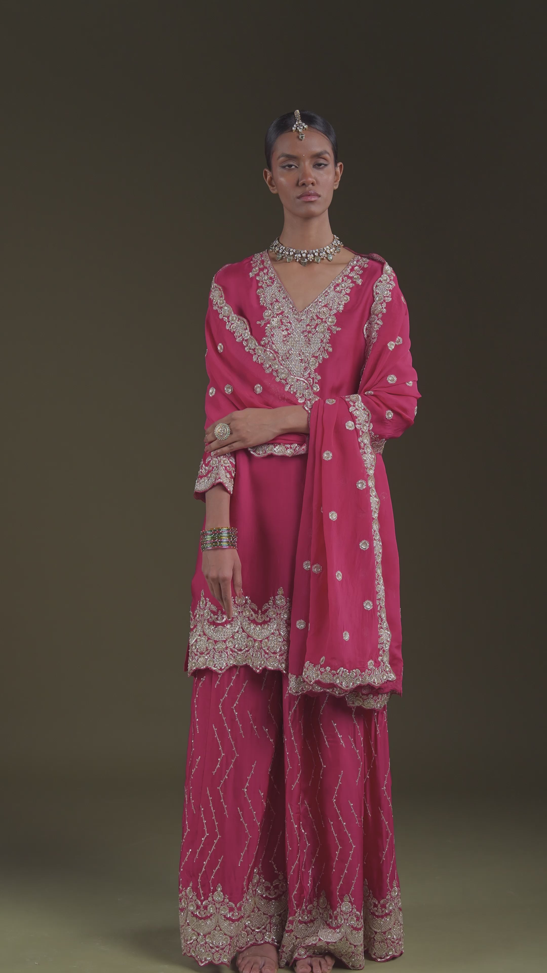 This vibrant ensemble features a satin silk kurta and palazzo set, glowing in rich pink tones and adorned with golden threadwork, sequins, and delicate bead embellishments. The soft organza dupatta adds a sheer elegance, completing the look with graceful charm.