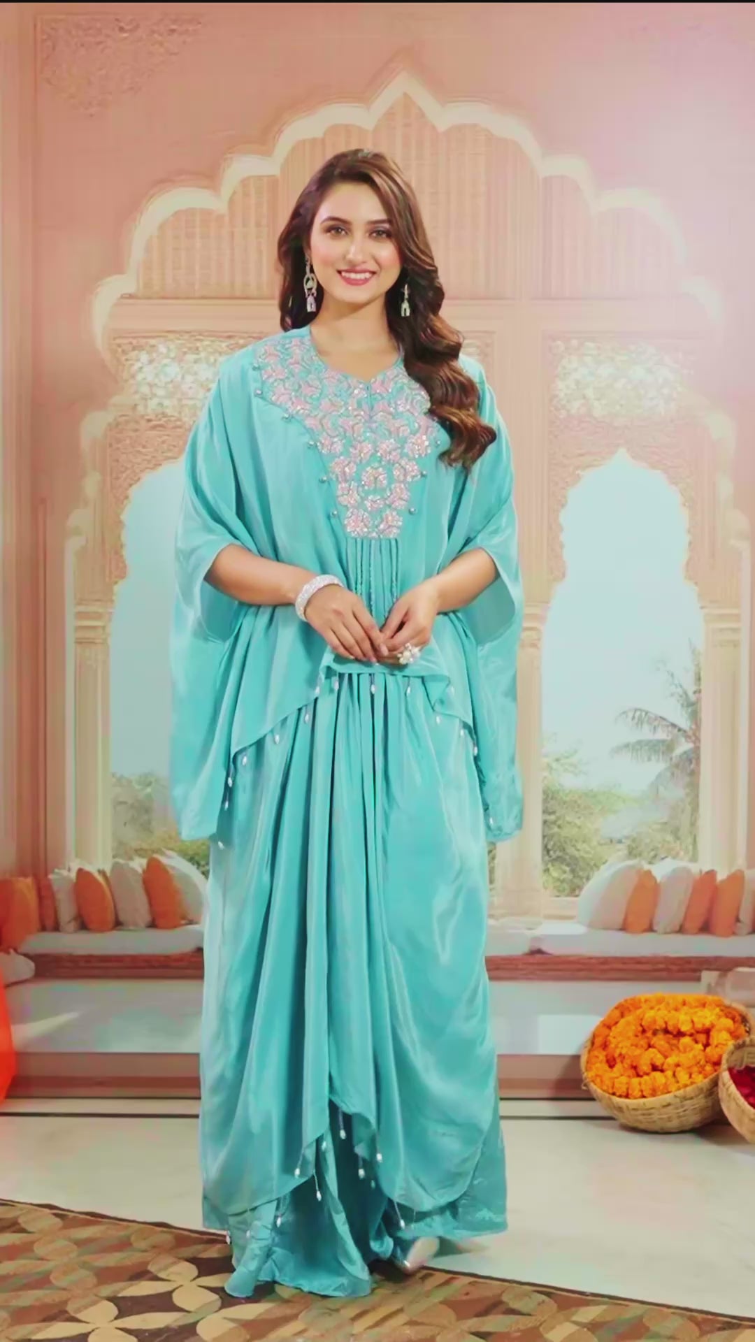 Resonates your look with style and refinement with our Blue Handwork Crepe Silk Skirt Set. The meticulously hand-worked of sequins, beads and cutdana work on the asymmetrical highlighted border tunic showcase exquisite craftsmanship. Complemented by matching premium silk draped skirt. This ensemble radiates effortless grace. Perfect for year-round festivities.