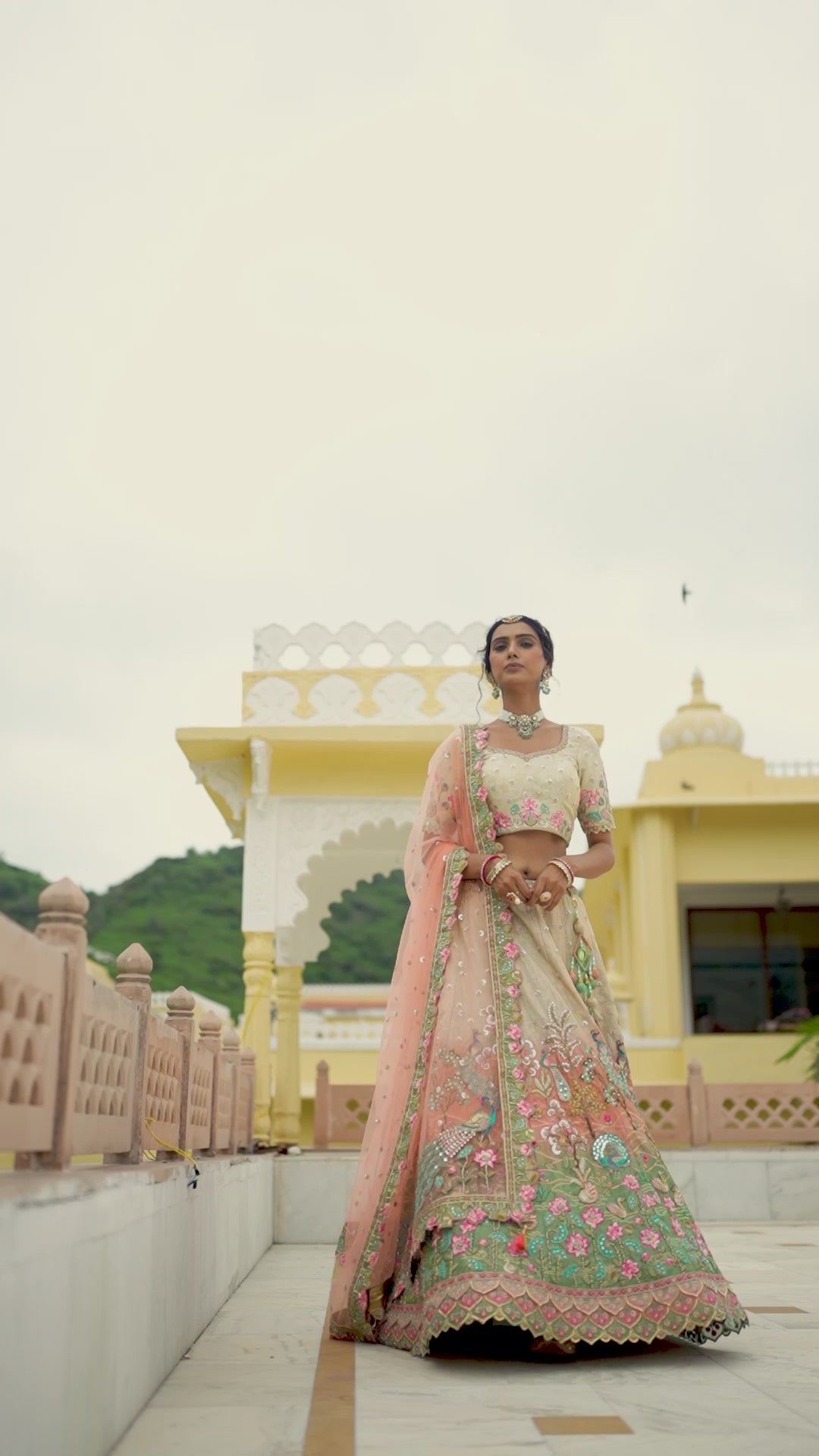 This traditional and elegant floral off white lehenga set is made with premium tissue silk fabric and features intricate embroidered and hand work details. The lehenga has a flare of 4.5 meters. The set also includes a off white blouse and net dupatta for a complete and sophisticated look. Perfect for special occasions like engagement, festival, sangeet, and wedding.