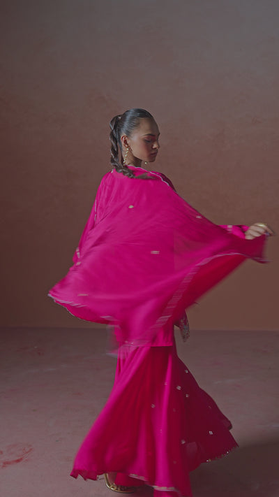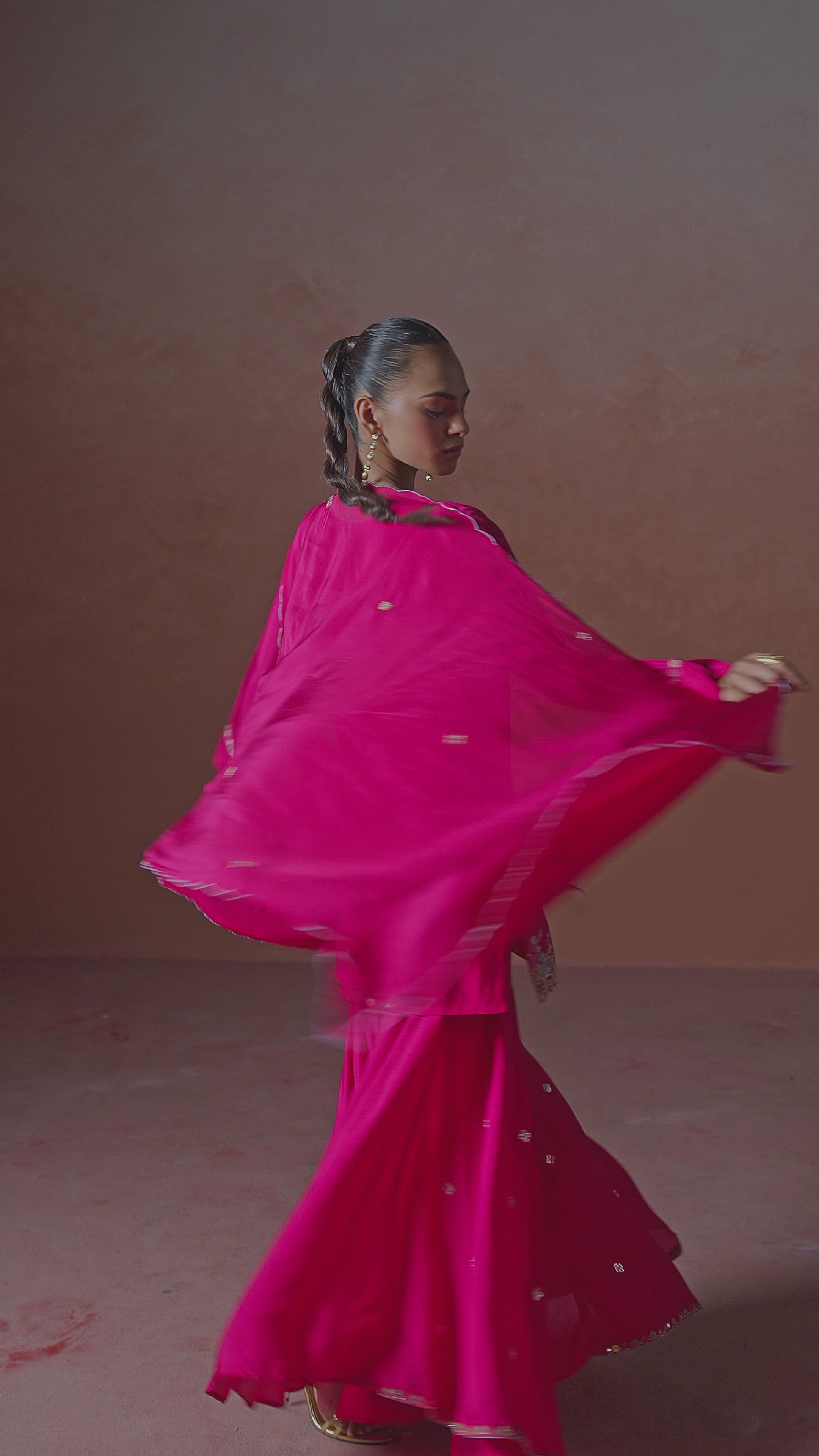 Hot Pink Embellished Kurta With Sharara and Dupatta with Scalloped Boreder