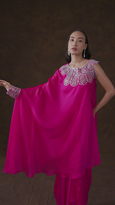 Hot Pink Embellished Georgette Silk Drape Skirt Set