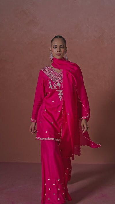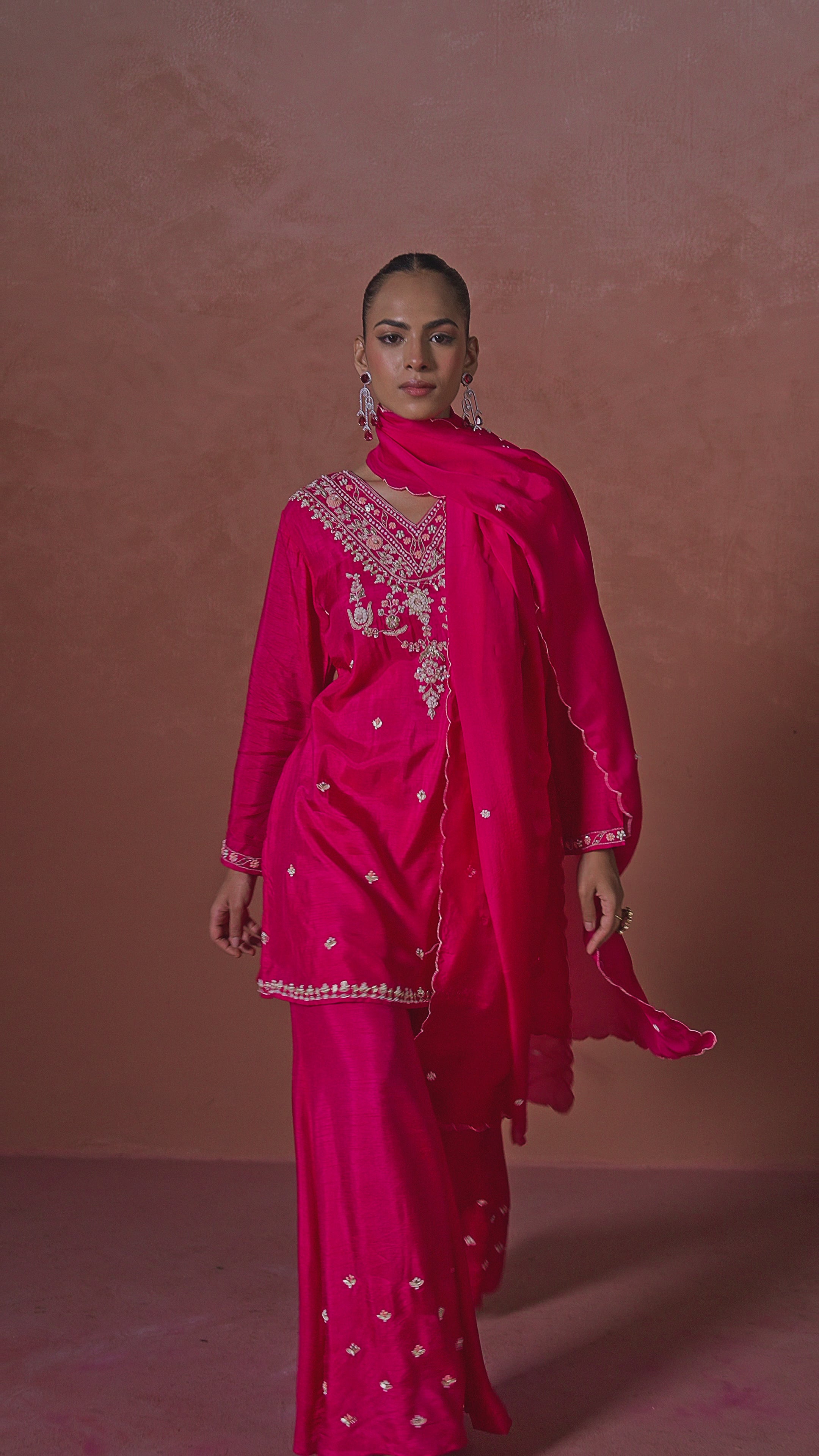 Hot Pink Embellished kurta, Flair Palazzo and Dupatta with Scalloped Border.