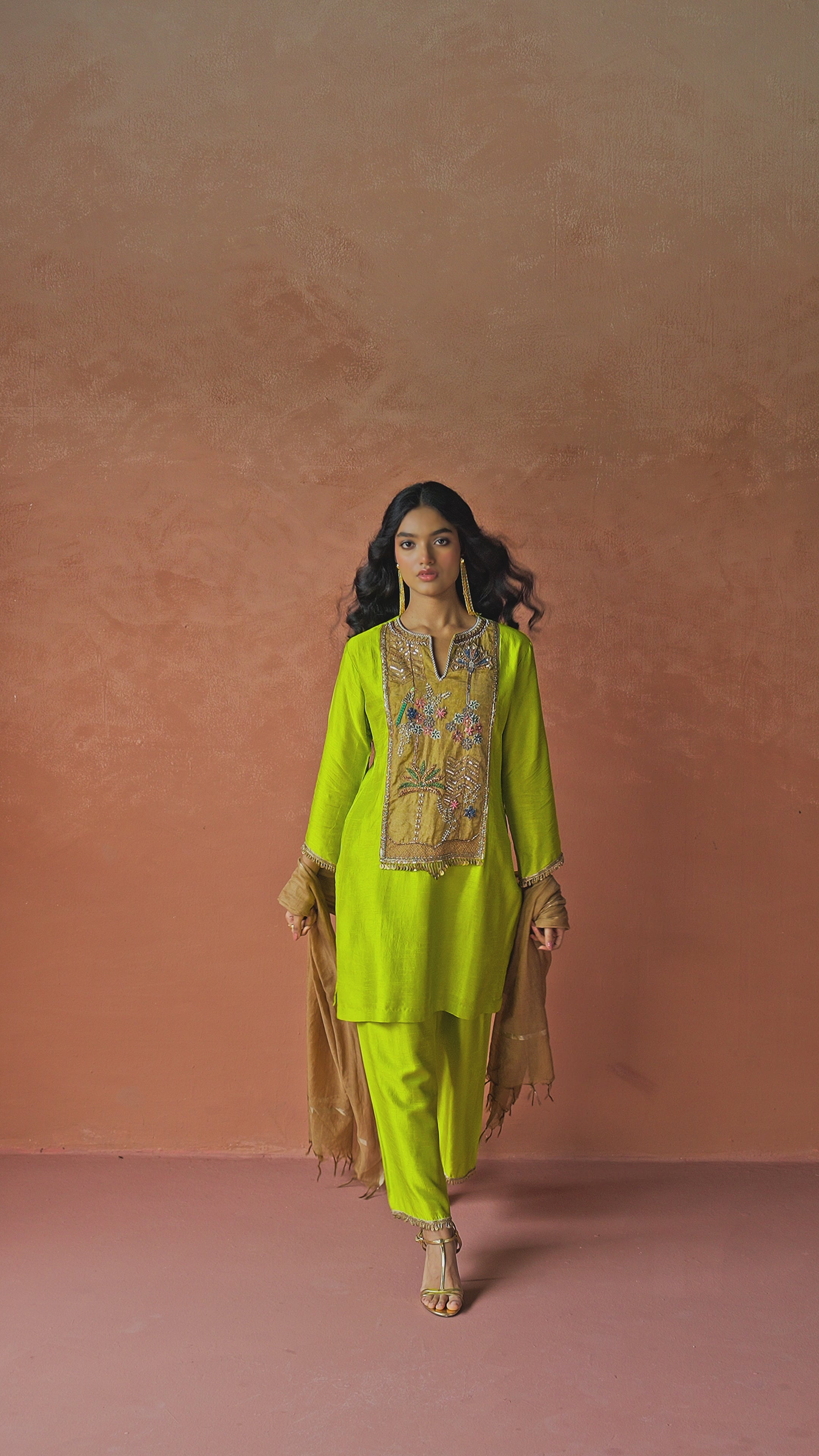 Crafted in rich raw silk, this bright green kurta set is adorned with exquisite sequin, bead, cut dana, zari, and multicolor thread work on the front panel. The kurta features delicate embellishments around the neckline and sleeves, paired with coordinating palazzo pants. A copper-hued dupatta with subtle sheen completes the look, adding a festive yet refined charm to this vibrant ensemble.
