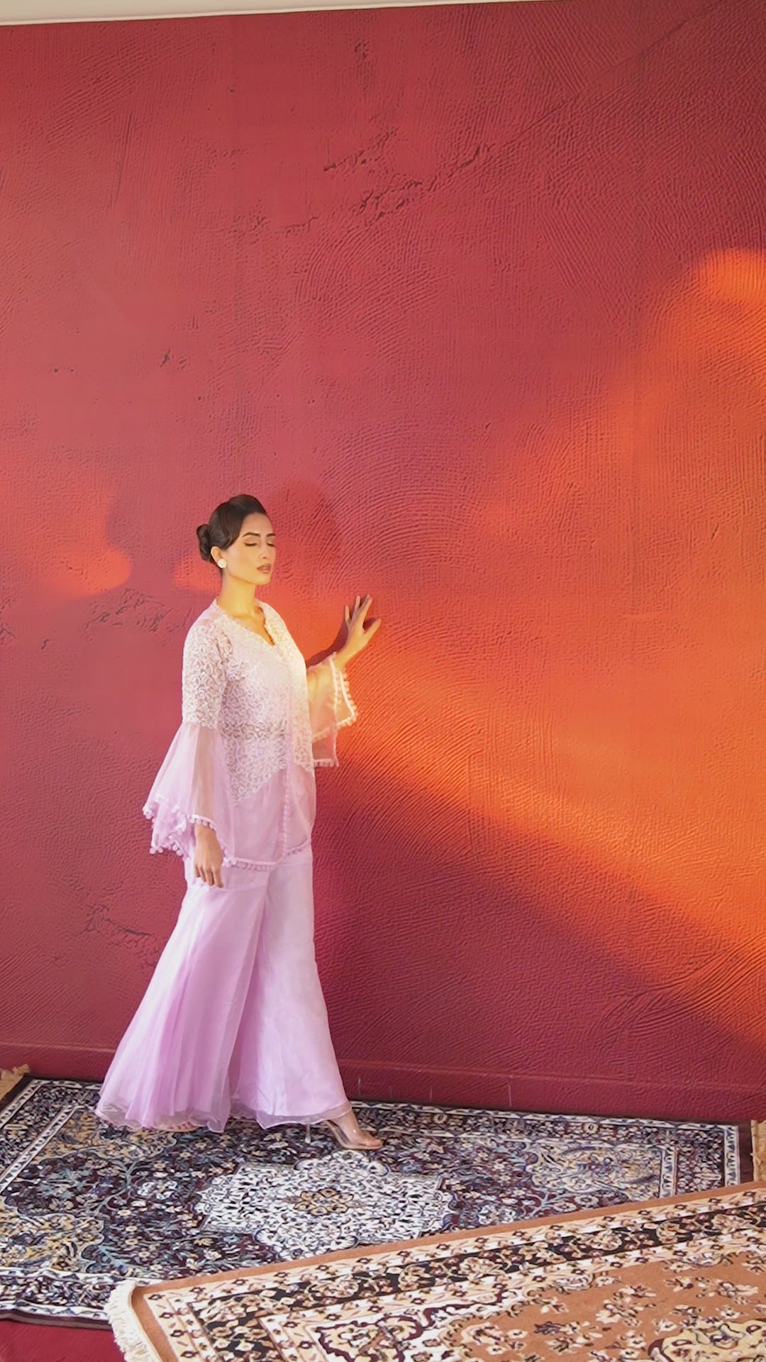 Taking our breath away, as this sheer piece of ensemble combines traditional work with contemporary flair which adds glamour and elegance to your festive look. It comes with exquisitely handcrafted bead work on organza silk pink blush jacket. Paired with matching solid organza sharara and a belgium silk solid padded crop top. Perfect for semi-formal wear.